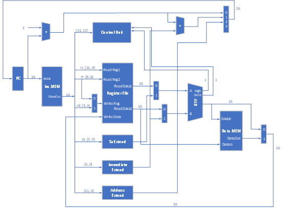 其中Ins.MEM为指令存储器,Data.MEM为数据存储器。访问存储器时,先给出内存地址,然后由读或写信号控制操作。对于寄存器组Register File,先给出寄存器编号,读操作时,输出端就直接输出相应数据;而在写操作时,当写使能信号为1时,在时钟边沿触发将数据写入寄存器。