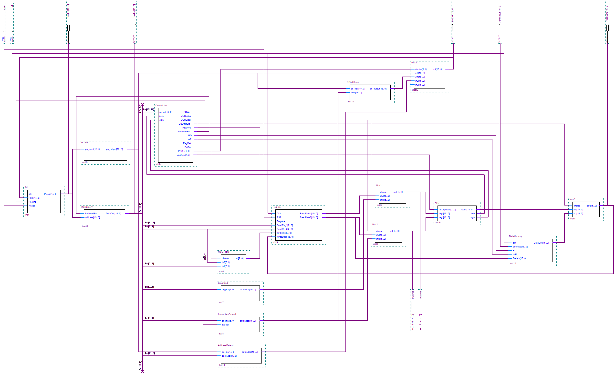 在顶层模块中,通过实例化各个底层模块,并使用导线将它们按照数据通路图连接起来,构成单周期CPU的完整结构,具体原理图如下: