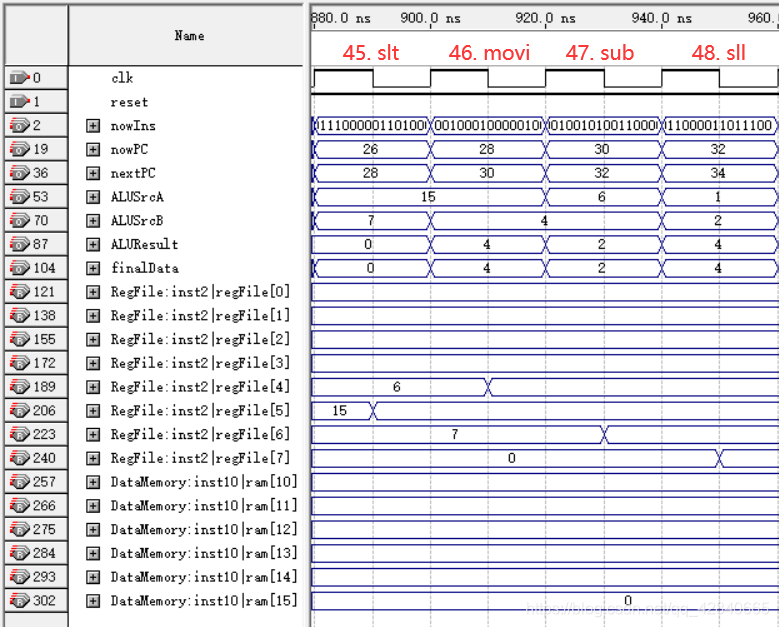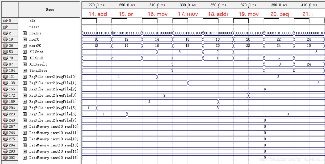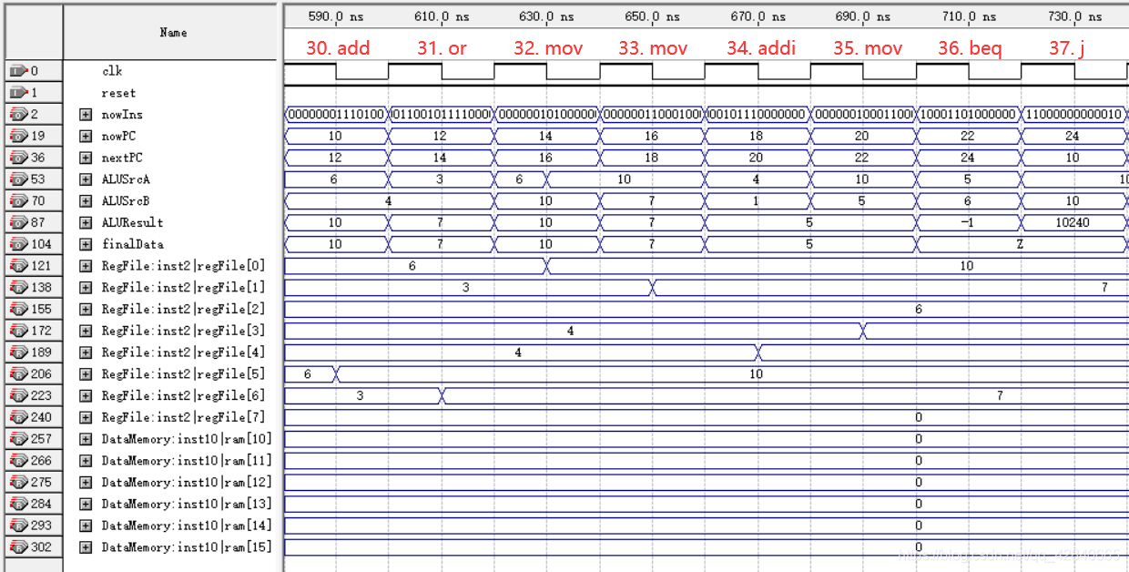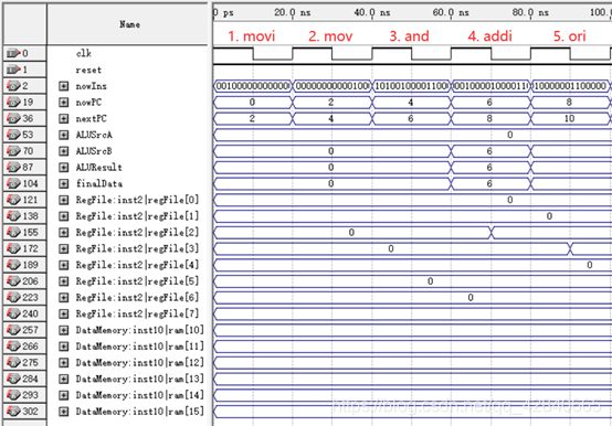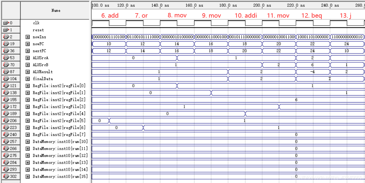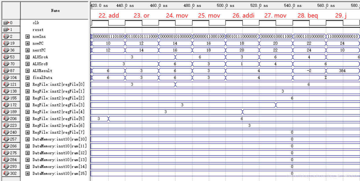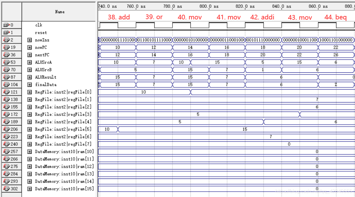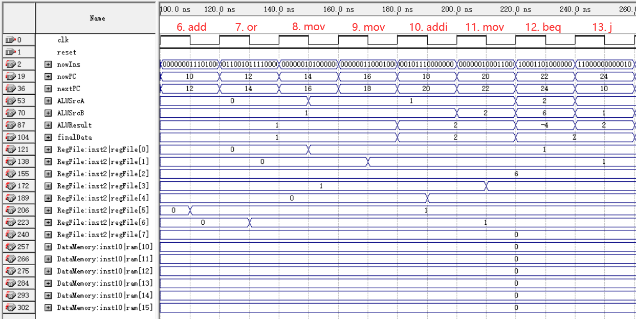 根据上述实现的单周期CPU,利用指令系统中所有的指令设计一个测试程序,对该CPU进行如下仿真验证。