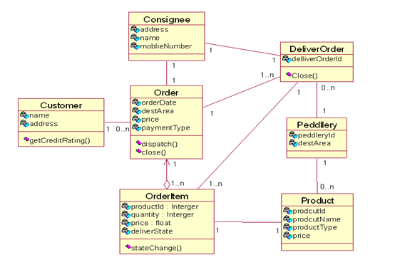 • 第二复杂关系的类就是deliverorder(送货单),和它相关的也有四个类:order、orderitem、consignee、peddlery,即表示送货单与订单是相关的,同时还关联到订单项。另外,与商户、收货人的关联关系也是显然的。