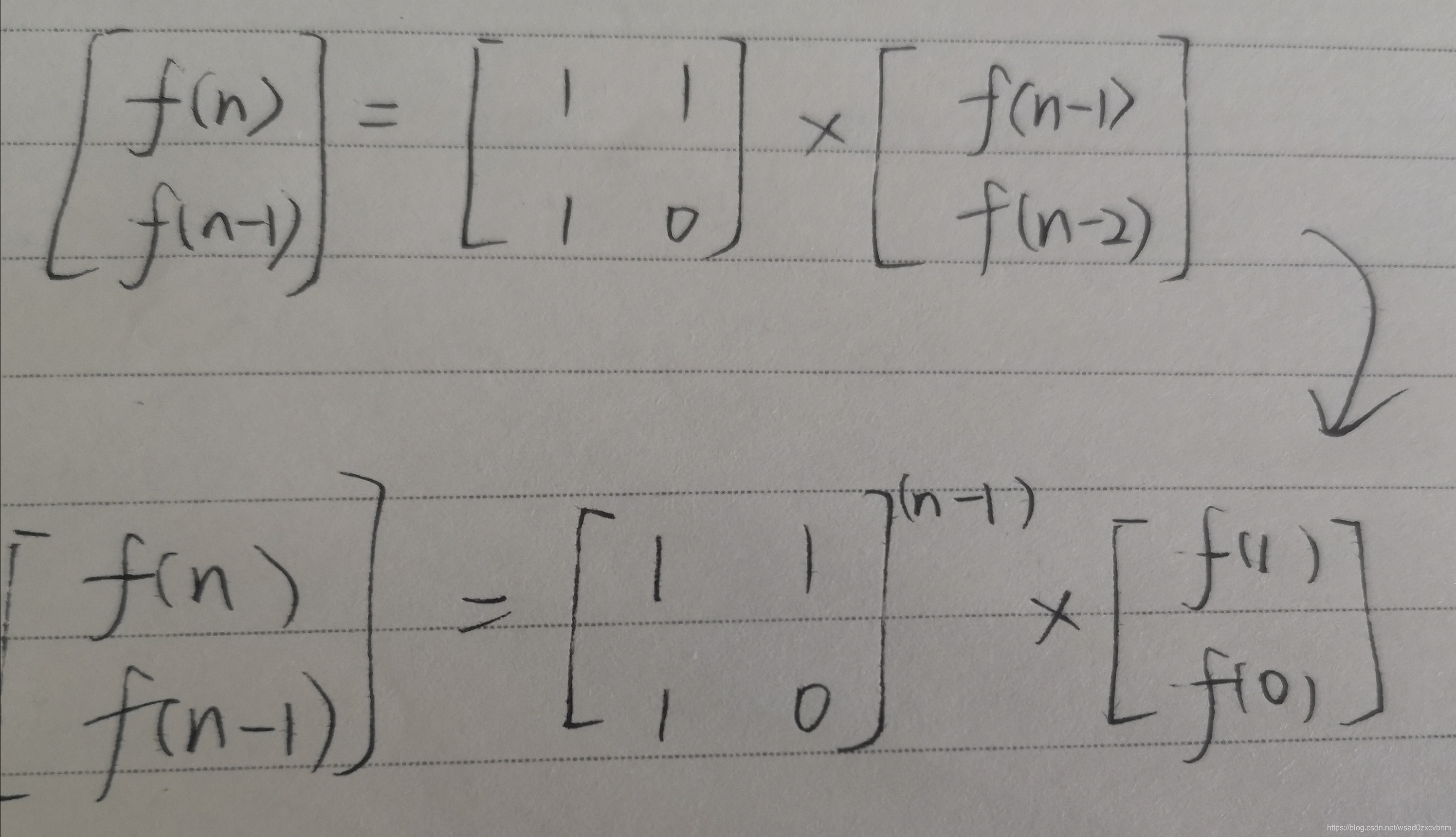 以[f(1), f(0)]为基准,f(1) = 1, f(0) = 0,所以矩阵幂得出的结果矩阵,只要第一项乘以f(1),即为其本身即可。