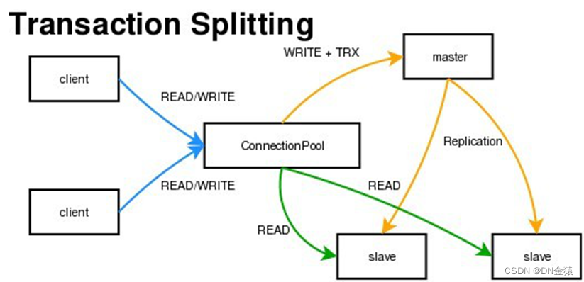 应用层中直接使用代码实现,在进入Service之前,使用AOP来做出判断,是使用写库还是读库,判断依据可以根据方法名判断,比如说以query、find、get等开头的就走读库,其他的走写库。