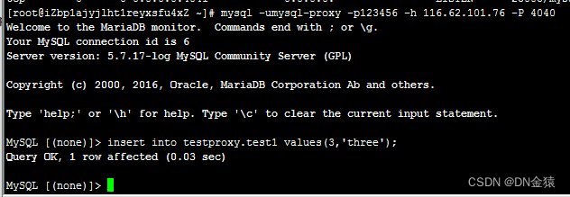 mysql -umysql-proxy -p123456 -h 116.62.101.76 -P 4040