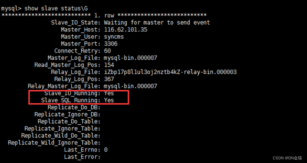 change master to master_host='填写master-IP', master_user='syncms', master_password='123456', master_log_file='mysql-bin.000005', master_log_pos=602;6.启动slave同步进程并查看状态。