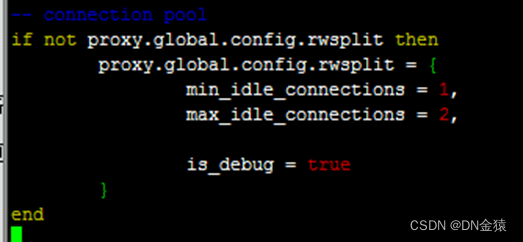 vim rw-splitting.luaMySQL Proxy会检测客户端连接,当连接没有超过min_idle_connections预设值时,不会进行读写分离默认最小4个(最大8个)以上的客户端连接才会实现读写分离,现改为最小1个最大2个,便于读写分离的测试,生产环境中,可以根据实际情况进行调整。