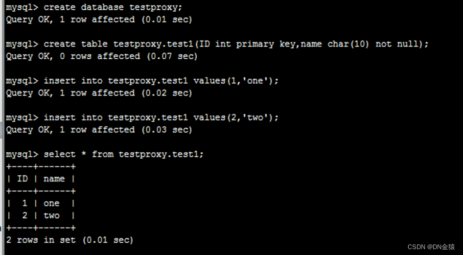 mysql> create table testproxy.test1(ID int primary key,name char(10) not null);