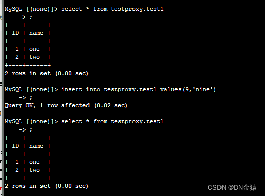 多开几个连接进行测试,当查询testproxy.test1表的数据显示是从库的数据时,读写分离成功。
