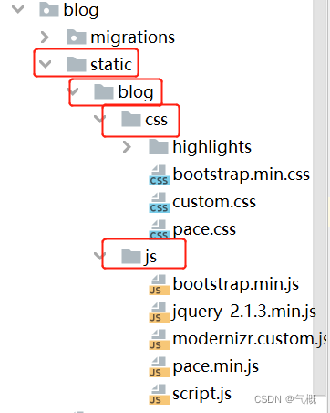 在blog文件夹下新建static文件夹,在其下新建blog文件夹,在其下新建css和js两个文件夹分别存放css样式文件和js脚本文件。目录结构为: