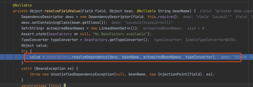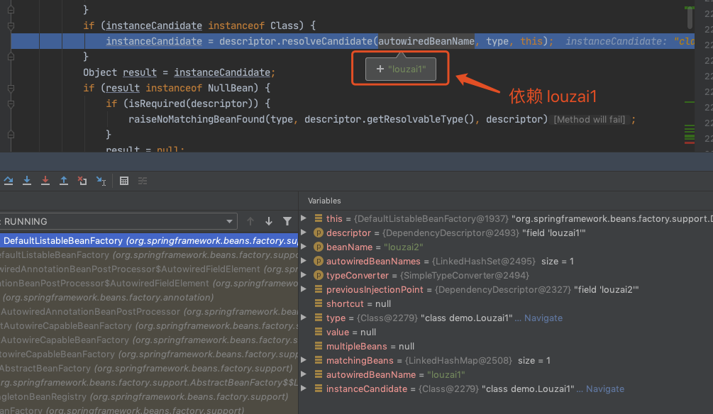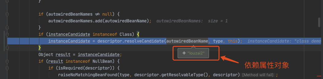 进入 doResolveDependency(),找到 louzai1 依赖的对象名 louzai2