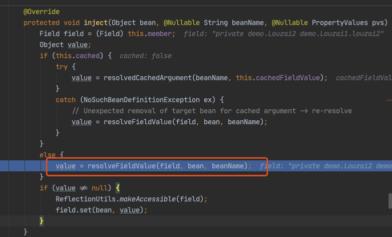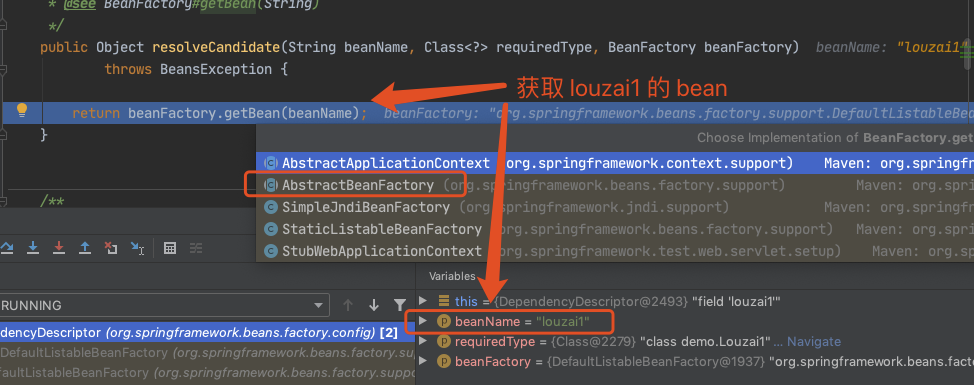 获取 louzai2 的 bean,从 doGetBean(),到 doResolveDependency(),和第一层的逻辑完全一样,找到 louzai2 依赖的对象名 louzai1。