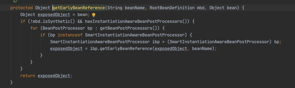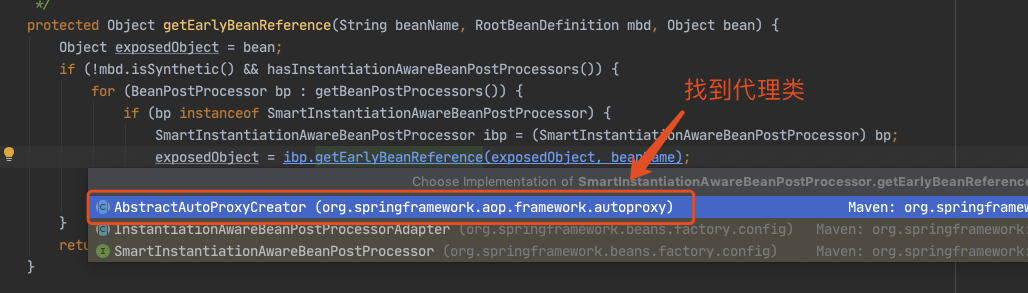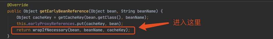 下面我们主要看这个对象工厂是如何得到的,进入 getEarlyBeanReference() 方法。