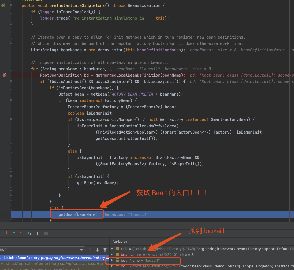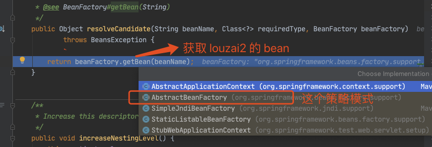 需要获取 louzai2 的 bean,是 AbstractBeanFactory 的方法。
