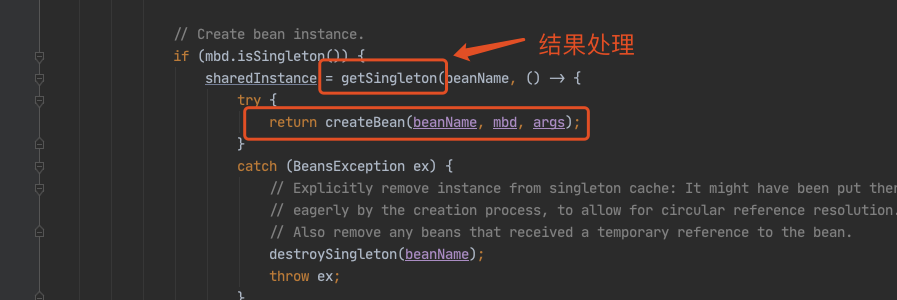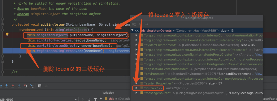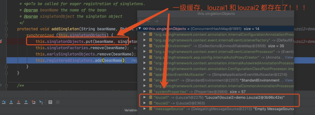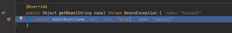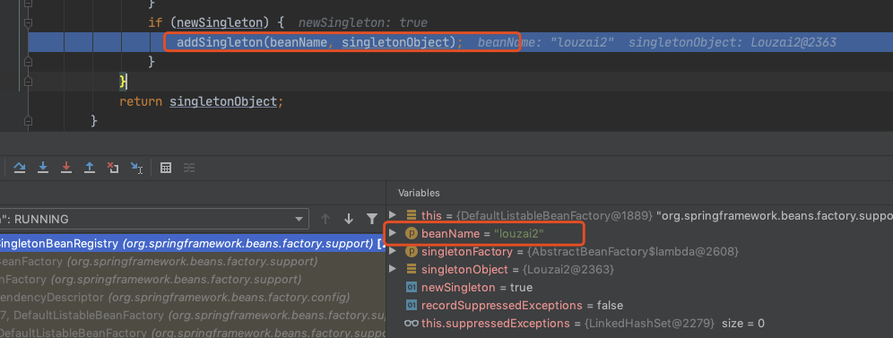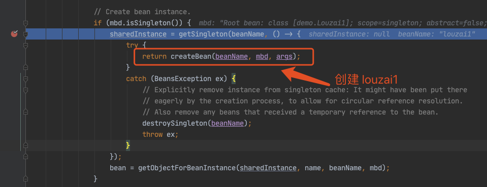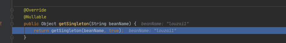 甭着急,看这里,还记得在 doGetBean() 中,我们会通过 createBean() 创建一个 louzai2 的 bean,当 louzai2 的 bean 创建成功后,我们会执行 getSingleton(),它会对 louzai2 的结果进行处理。