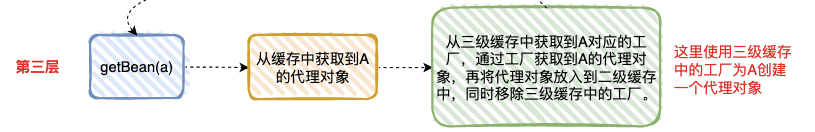 在第三层中,去创建 A,因为第一层已经创建了 A 的代理工厂,直接从“三级缓存”中拿到 A 的代理工厂,获取 A 的代理对象,放入“二级缓存”,并清除“三级缓存”;