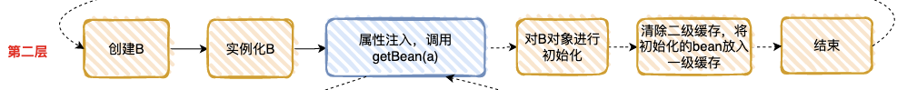 回到第一层,现在 B 初始化成功,完成 A 对象的属性注入,然后再填充 A 的其它属性,以及 A 的其它步骤(包括 AOP),完成对 A 完整的初始化功能(这里的 A 才是完整的 Bean)。