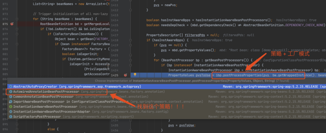 进入到 populateBean(),执行 postProcessProperties(),这里是一个策略模式,找到下图的策略对象。