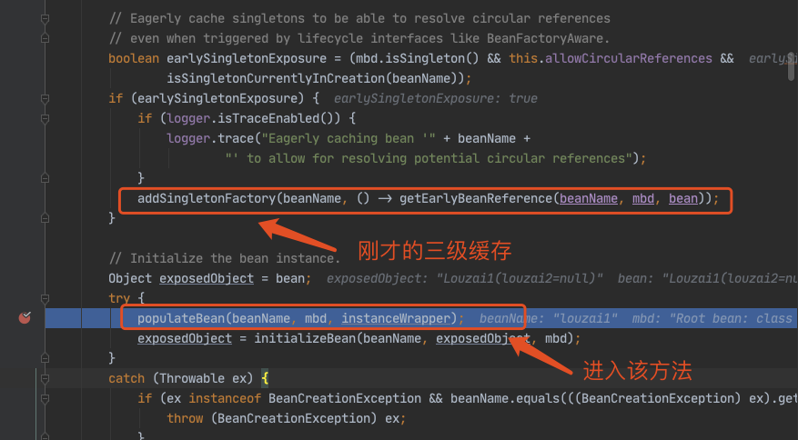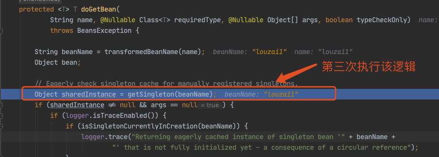 获取 louzai1 的 bean,在第一层和第二层中,我们每次都会从 getSingleton() 获取对象,但是由于之前没有初始化 louzai1 和 louzai2 的三级缓存,所以获取对象为空。