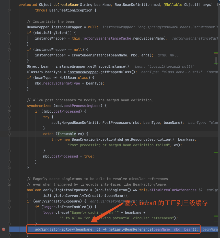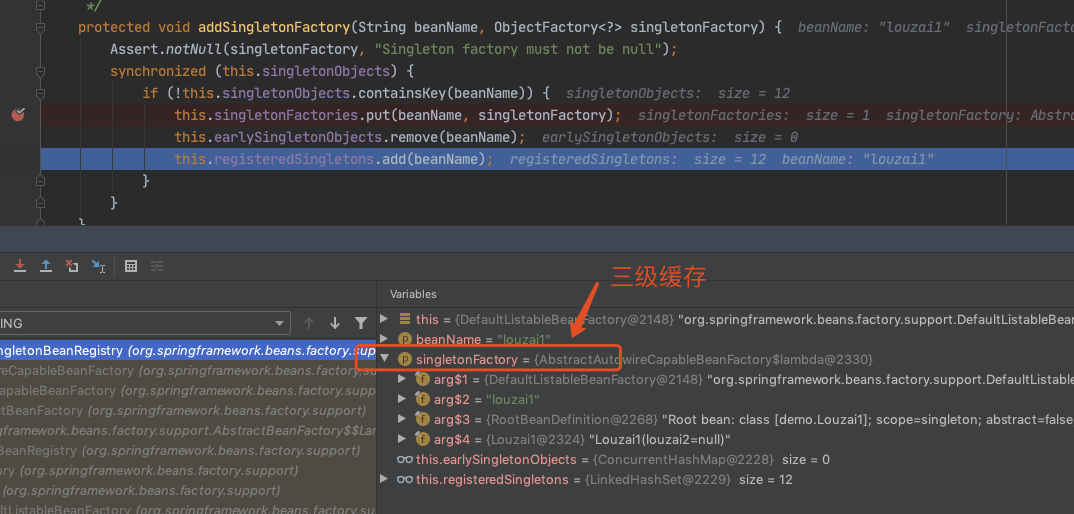 往三级缓存 singletonFactories 塞入 louzai1 的工厂对象。