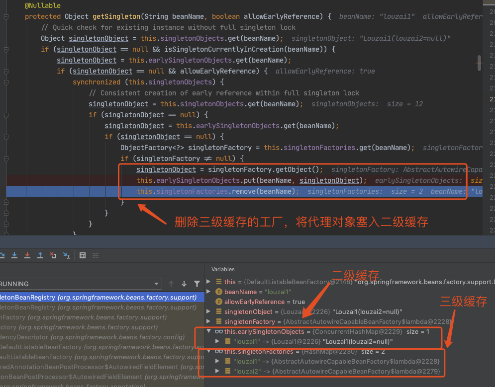 到了第三层,由于第三级缓存有 louzai1 数据,这里使用三级缓存中的工厂,为 louzai1 创建一个代理对象,塞入二级缓存。