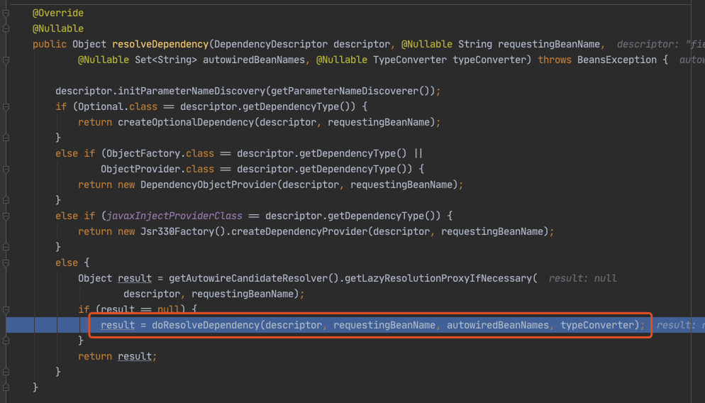 前面的流程全部省略,直接到 doResolveDependency()。