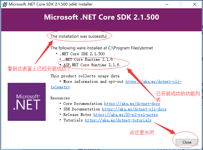 2.双击你下载好的sdk然后傻瓜式的一步一步的进行安装即可,微软的软件的安装太简单的,以至于我如果再细说你们都会嫌我啰嗦了。所以,这里我只贴一张安装成功的图吧。
