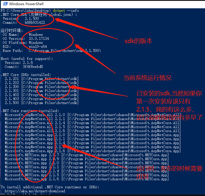 3.接下来按住 Shift+鼠标右键,然后选择“在此处打开Powershell窗口”或者“在此处打开命令行窗口”。然后输入dotnet --info 查看下我们已经安装的.NET Core 的信息,当前运行的环境,已经以往安装的版本信息,我的版本比较多,因为我用了很长时间了。如果你第一次安装可能只有一个。出现下面第二张图的界面也就说明我们的.net core开发环境已经就绪了!下面就让我们撸起袖子开始干吧。