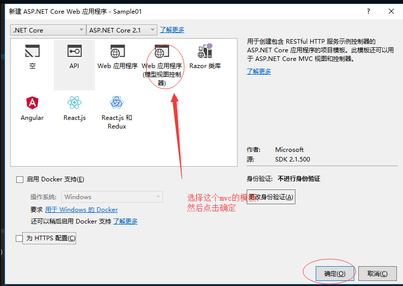 2.哈哈,上图点击确定后并没有创建成功,而是会弹出下一个对话框,如下所示,他会让你选择目标框架是.NET Core还是.NET Framework;是选择创建一个空的解决方案还是创建一个带有模板的web项目!至于各自的区别,有兴趣的朋友可以每个都创建一下然后对比下各自的区别哦!这里我们按照下图所示选择MVC的web应用程序: