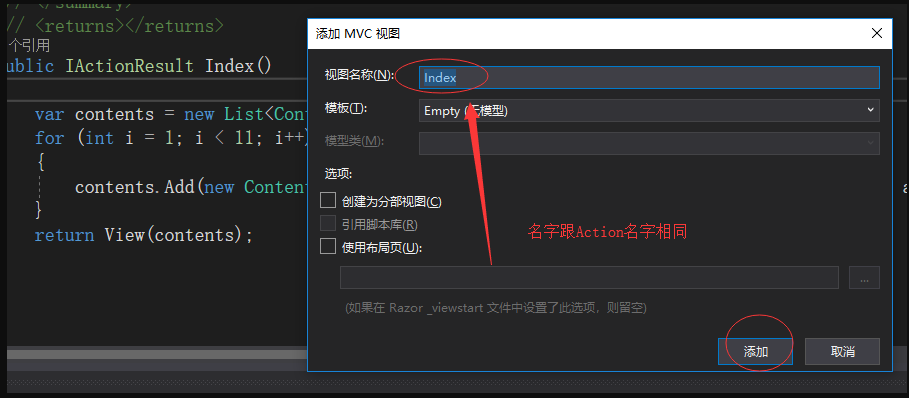 }9.Views:模型跟控制器都建好了,那我们就建一个视图来显示我们创建的数据吧!我们可以有很多种方式创建这个视图,这里给你介绍一种傻瓜式的,把鼠标放在Index大括号里面,然后鼠标右键选择创建视图,如下所示即可创建视图文件,位置在/Views/Content/Index.cshtml文件:
