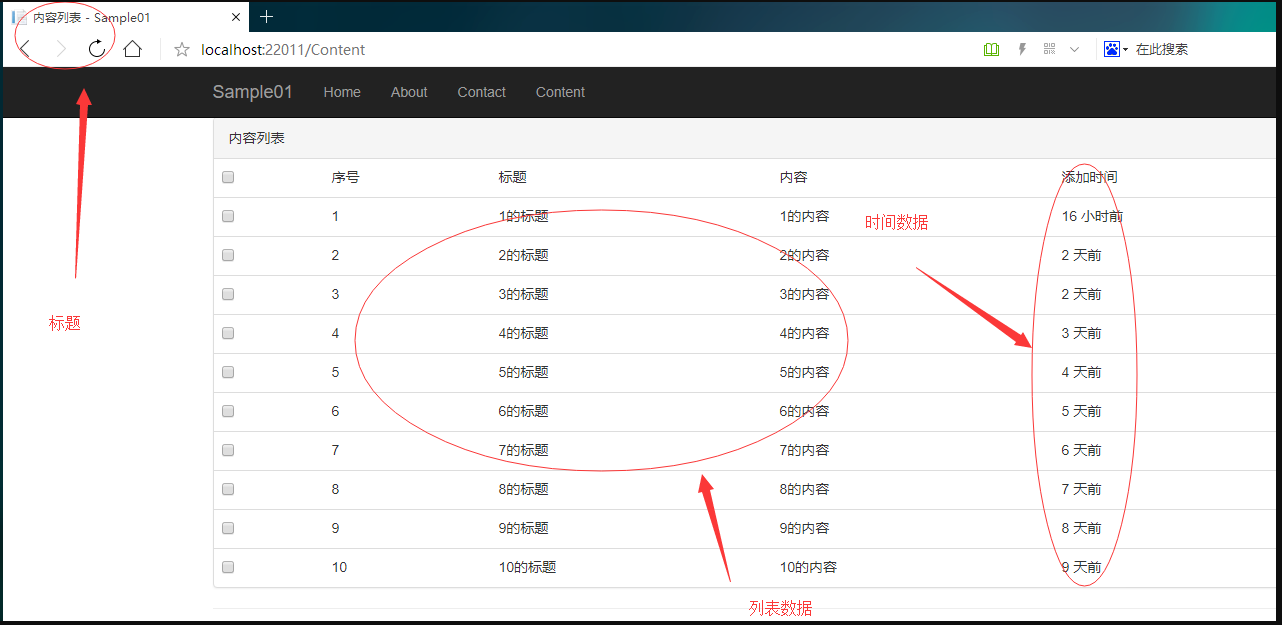 12.到这里代码基本完成,按下你的F5键,然后导航到Content看下效果吧: