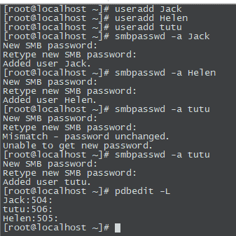 通过添加系统用户后再添加samba用户给他设定密码,更能保证安全性,最后通过命令pebedit -L 来查看用户