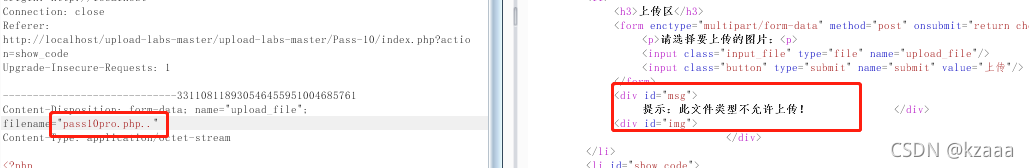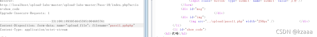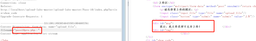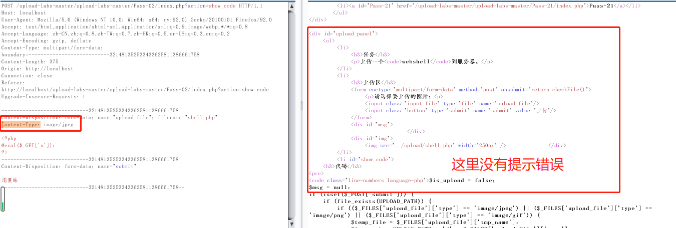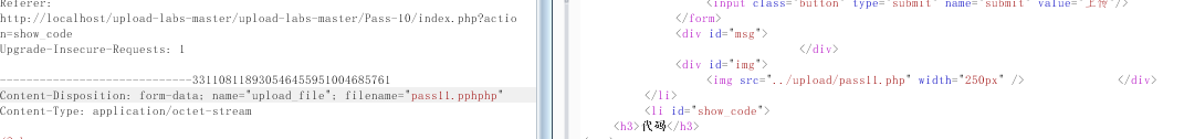 }在进行文件上传时,浏览器会设置一个请求头Content-Type对上传文件的类型进行说明,而这一关在后台中采用$_FILES['upload_file']['type']对文件上传的类型(Content-Type)进行校验