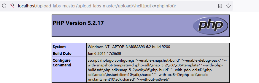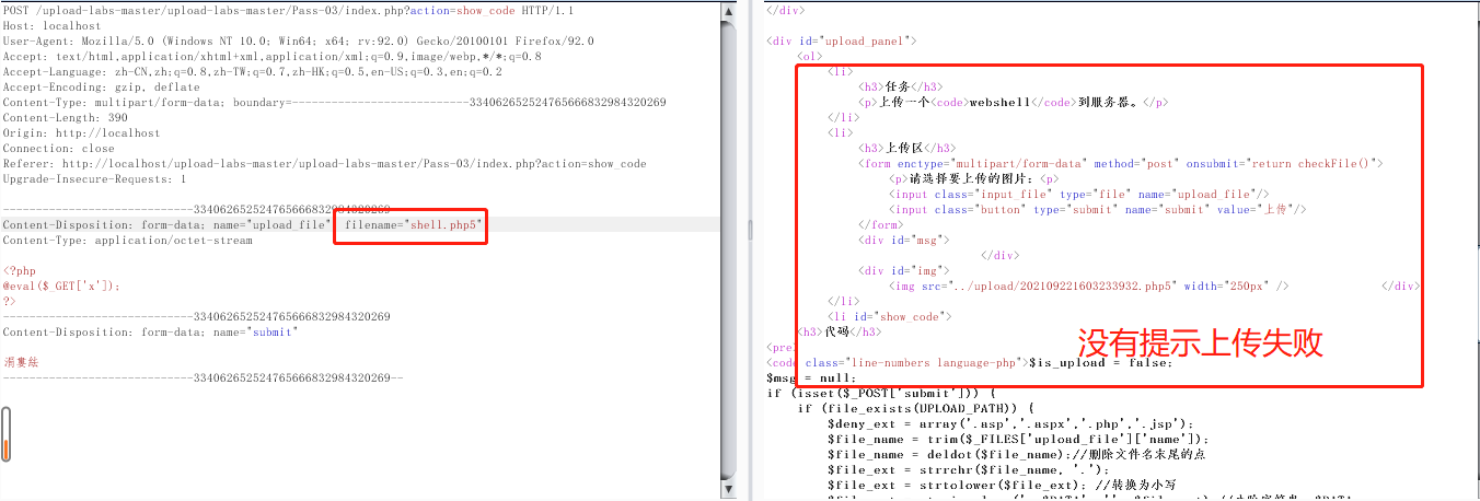 与前面的源码相比,少了$file_ext = strtolower($file_ext); //转换为小写,虽然黑名单比较大,但还是可以上传后缀为phP* PHP* PHp* pHP* Php* 的文件