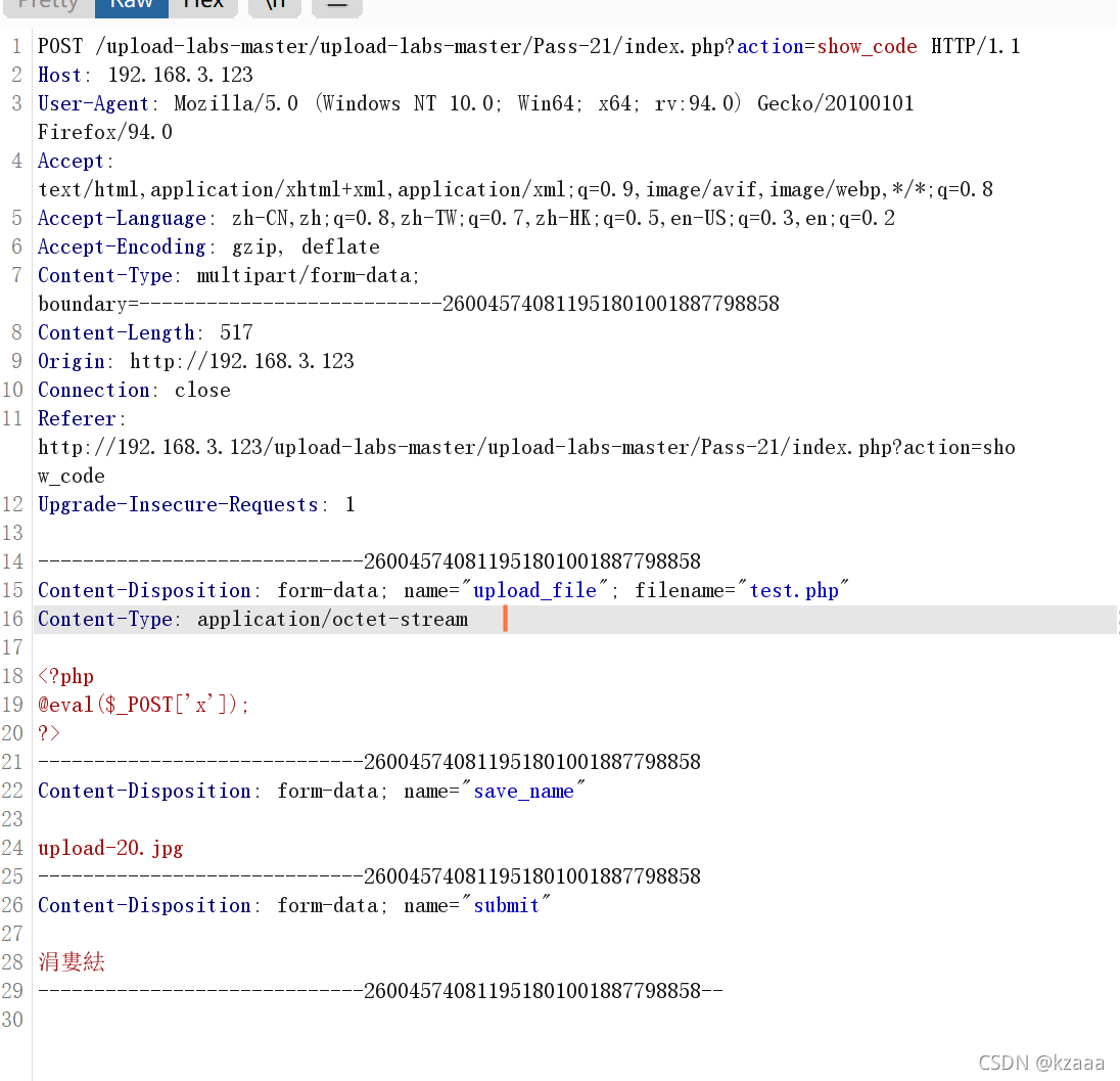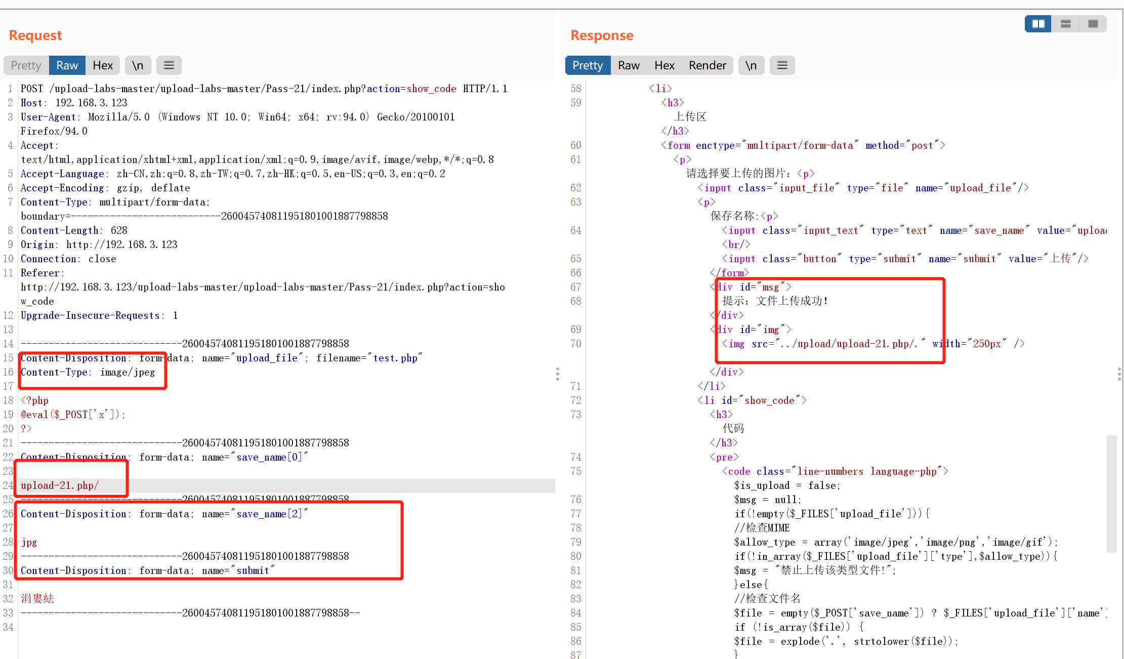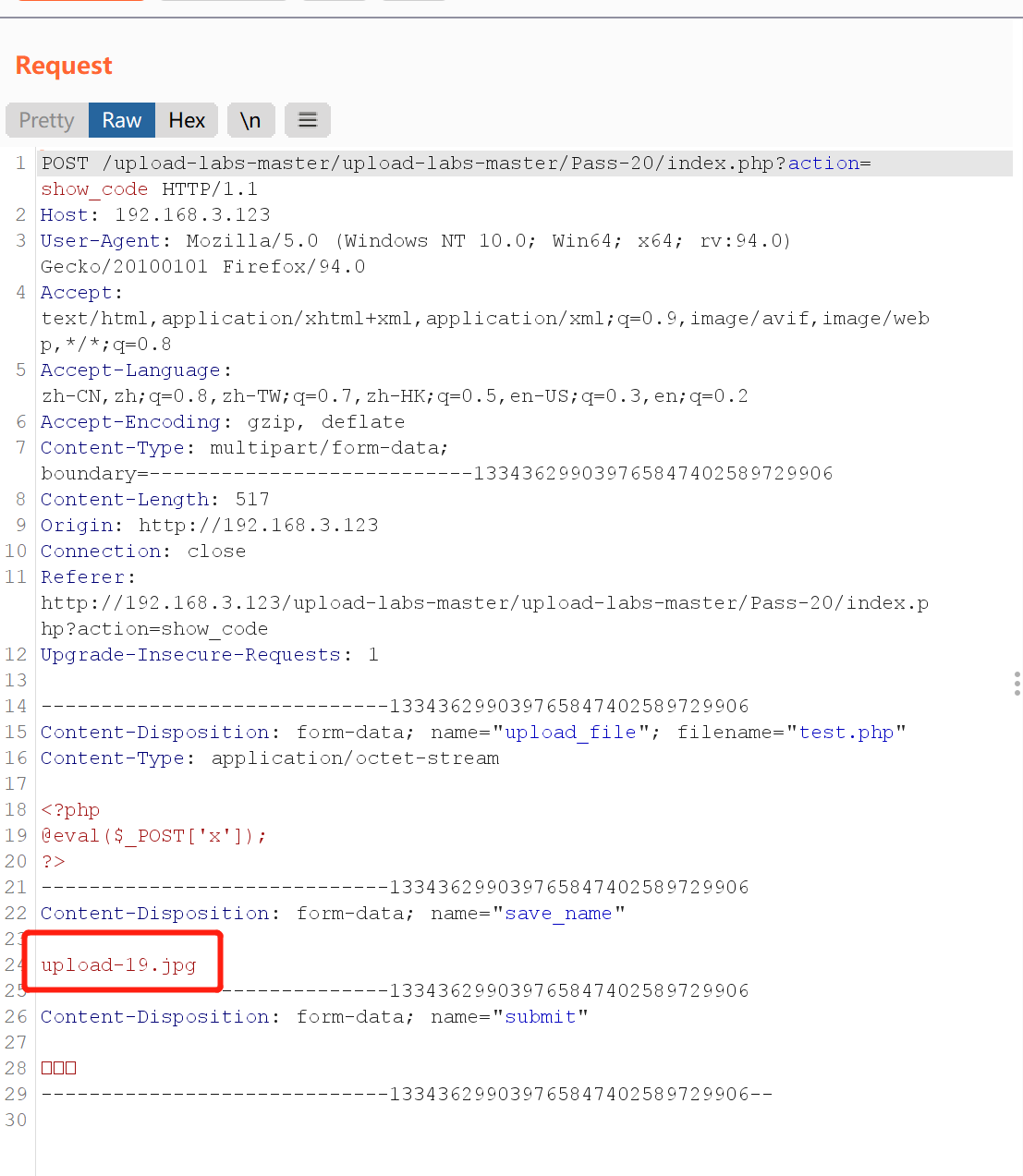 方法二:也可以将上传的文件后缀修改为合法后缀,然后抓包修改为原来的后缀