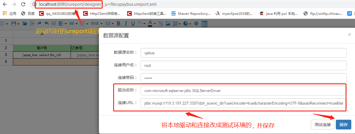 启动ureport生成xml文件的项目,也浏览器中修改本地配置文件,并保存。此时本地也连接了测试数据库