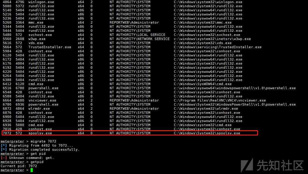 我们使用ps查看当前进程,然后选中一个看起来比较持久的幸运儿spoolsv.exe(这是一个用来控制打印的进程,我遇到的机器基本都开启了此进程)