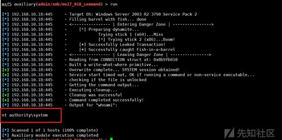 另外对于ms17-010,如果说打2003的机器,建议使用auxiliary/admin/smb/ms17_010_command模块进行执行命令获得session;其他的可以直接使用exploit/windows/smb/ms17_010_eternalblue或者exploit/windows/smb/ms17_010_psexec来直接获得session。