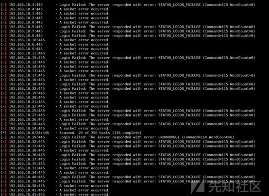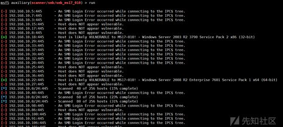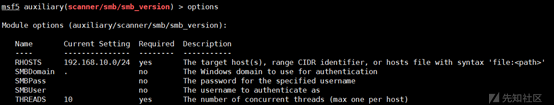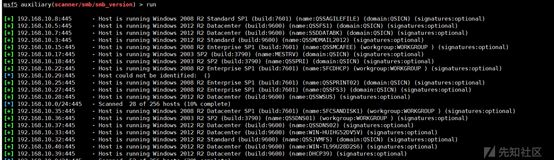 先使用auxiliary/scanner/smb/smb_version模块扫描一下各网段的smb服务开启情况