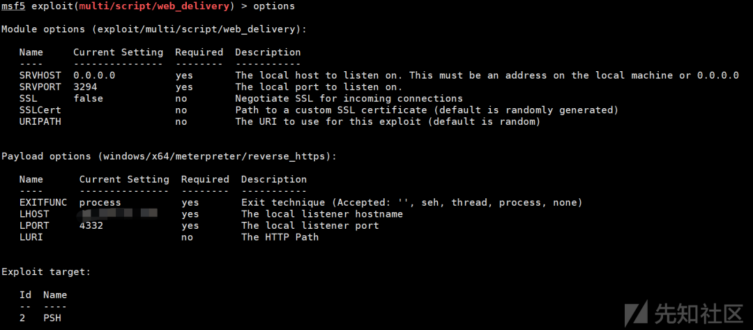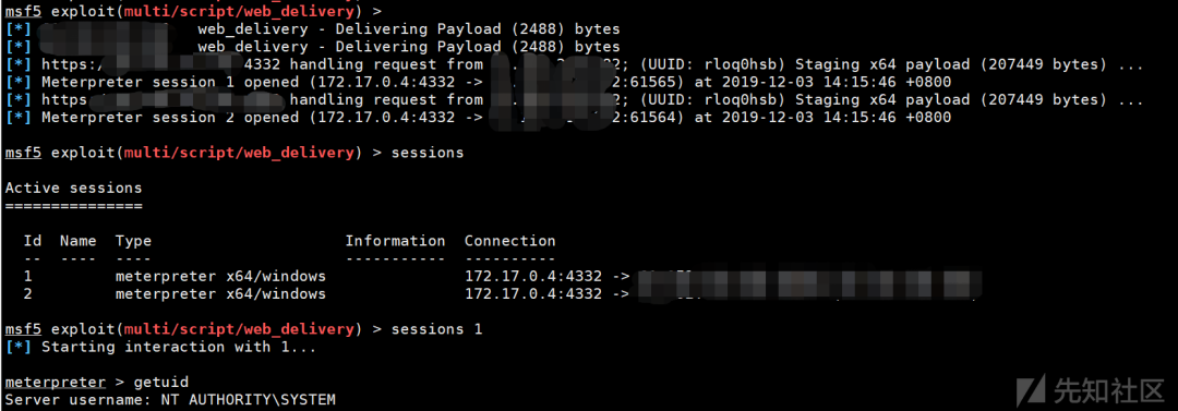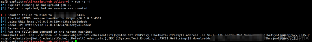 再次打开msf,本次尝试使用web_delivery配合终端执行powershell指令来获得session。