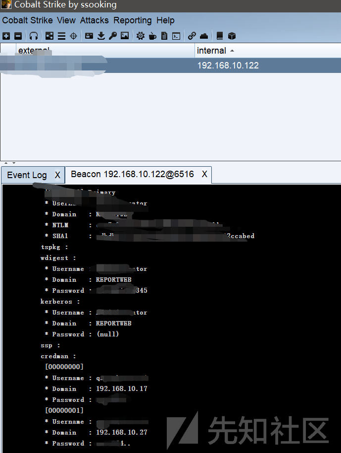 比较遗憾的是没能获取到明文密码,但是我这边使用cobalt strike加载的mimikatz成功获取到明文密码
