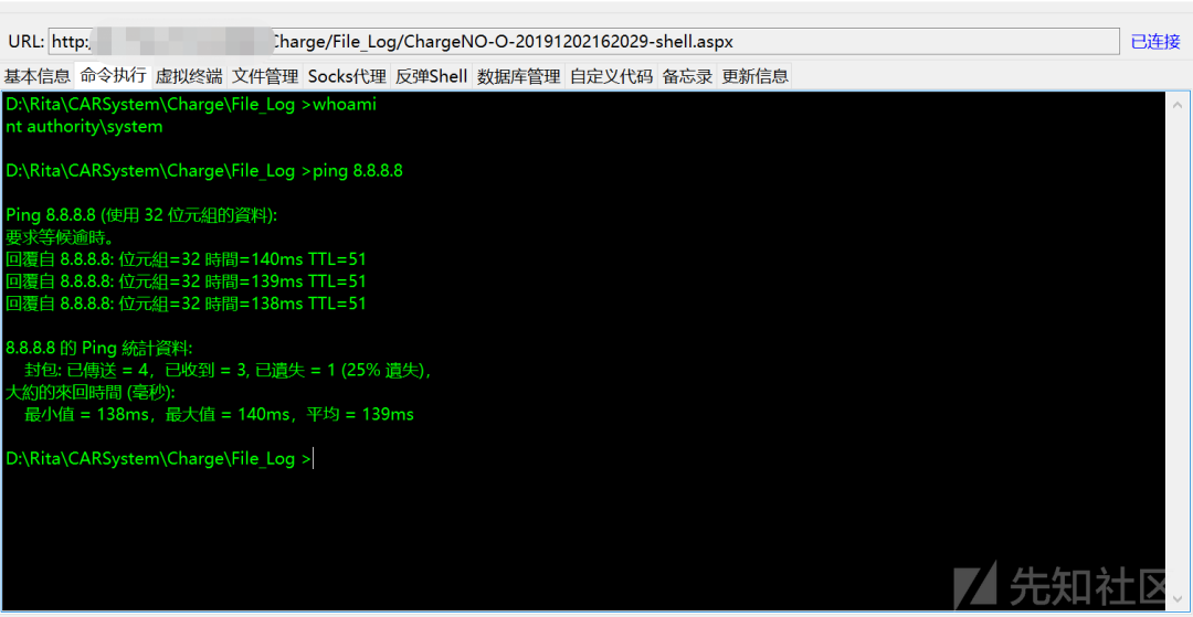 获得payload,使用冰蝎或者C刀模拟终端直接执行,成功获得session,执行getuid发现权限为system权限,省去了提权过程。