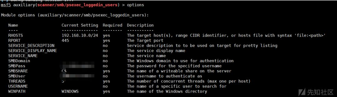 然后,使用auxiliary/scanner/smb/psexec_loggedin_users模块配合已获得的两组账户密码进行横向