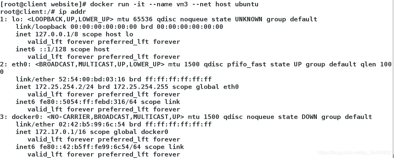 [root@client website]# docker run -it --name vm3 --net host ubuntu --net指定网络模式为host主机模式
