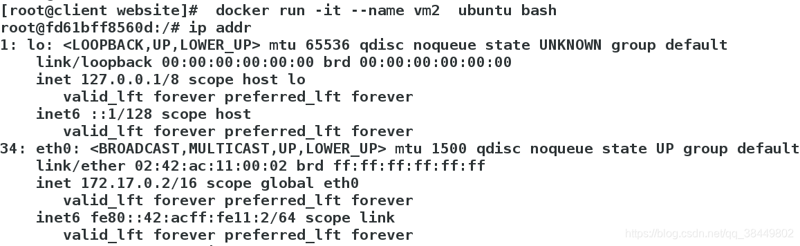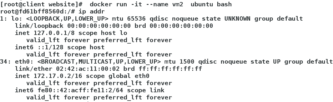 [root@client website]# docker run -it --name vm2 ubuntu bash #先运行vm2,供新的使用