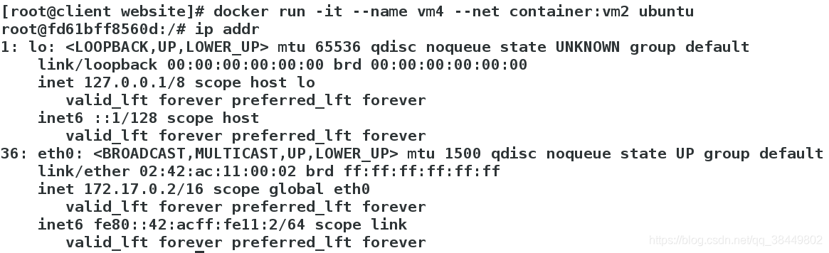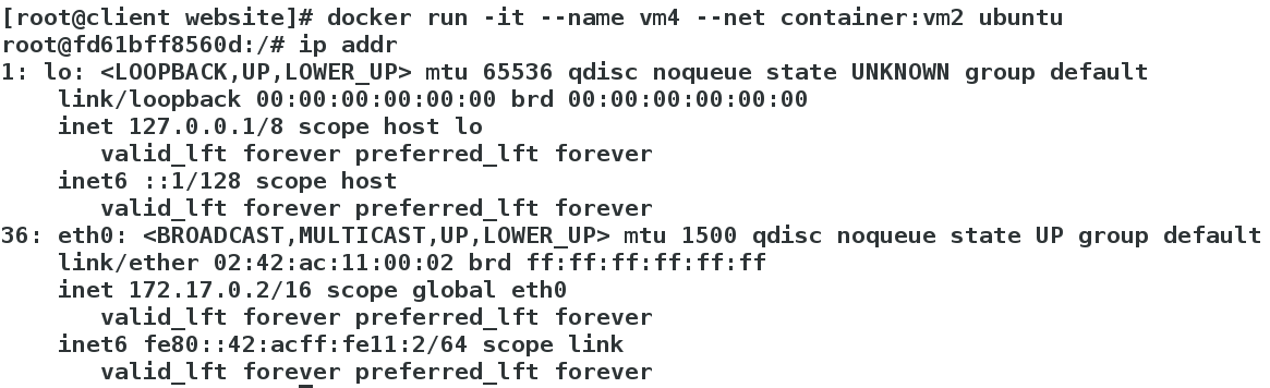 [root@client website]# docker run -it --name vm4 --net container:vm2 ubuntu # 指定以container模式运行