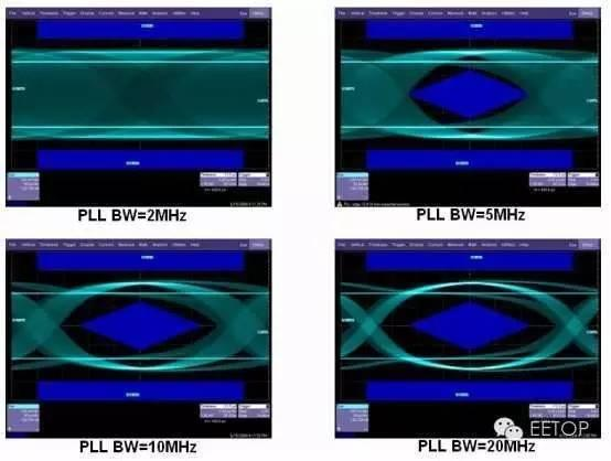 (4)优化误码率——调整关于数据信号的时钟相位 举例说明 PLL 带宽对眼图测试的影响: