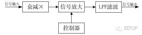 上述电路框图中,信号放大部分首先应该实现固定增益的放大,然后再利用控制器对 信号实现程控增益的放大。对于后续的低通滤波模块,应该设置几个档位的 LPF,以实现对不同信号的处理。