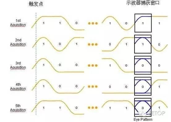 示波器中传统的眼图测量方法就是同步触发一次,叠加一次,然后再触发再叠加。每 触发一次,眼图上增加一个 UI,每个 UI 的数据是相对于触发点排列的,因此是“Single-Bit Eye”,其形成过程如下图所示: