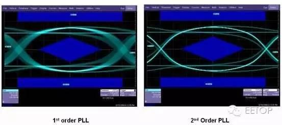 从上图可以看出,二阶 PLL 有更加陡峭的滚降系数。下图为两者在眼图测试中的影响。