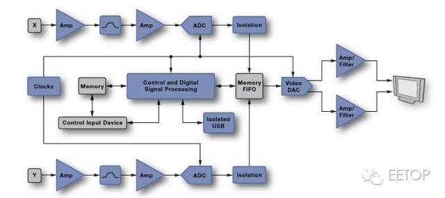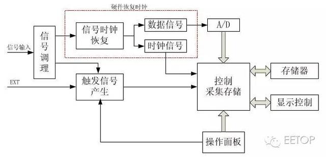 (4)现代方法只是利用软件进行时钟的恢复,因此只要从大量数据中提取到时钟信号就 可以将眼图恢复出来。因此,该方法可以对局部放大之后的波形做眼图,可以对历史保存的波形做眼图,并且可以有一些高级眼图分析功能,相比传统眼图生成方法,其具有很大的优势。 通过以上对眼图形成原理和方法的分析,我们知道眼图形成电路原理与数字示波器采集信号原理类似,只是没有数字示波器设计那么复杂,因此,在本文以下的章节中,先主要讲解数字示波器的形成原理,再结合实际将眼图形成的电路框架构建出来。