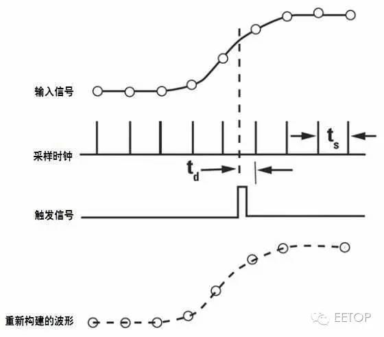 实时示波器中,可以根据数据本身的特性来实现信号的触发功能,并且通常输入波形 的幅度达到一个特定阈值时,触发就会发生。示波器此时开始以异步速率 (与输入波形的数据速率没有任何关联) 将模拟波形转换为数字数据点。该转换速率即采样速率,它通常源于一个内部时钟信号。示波器对输入波形的幅度进行采样,并将这个幅度值存储到存储 器中,然后继续下一个采样。触发的主要工作是为输入数据提供一个水平时间参考点,具体数据采集原理如下图所示: